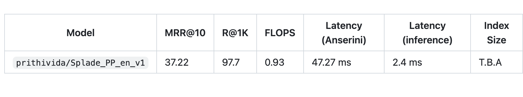 So, by design "how to beat SoTA MRR?" was never our goal, Instead "At what cost can we achieve an acceptable effectiveness i.e. MRR@10". Non-chalantly reducing lambda values (Ξ»Q,Ξ»D, see above table) will achieve a better MRR. But Lower lambda values = Higher FLOPS = More tokens = Poorer efficiency. This is NOT desirable for a Industry setting.